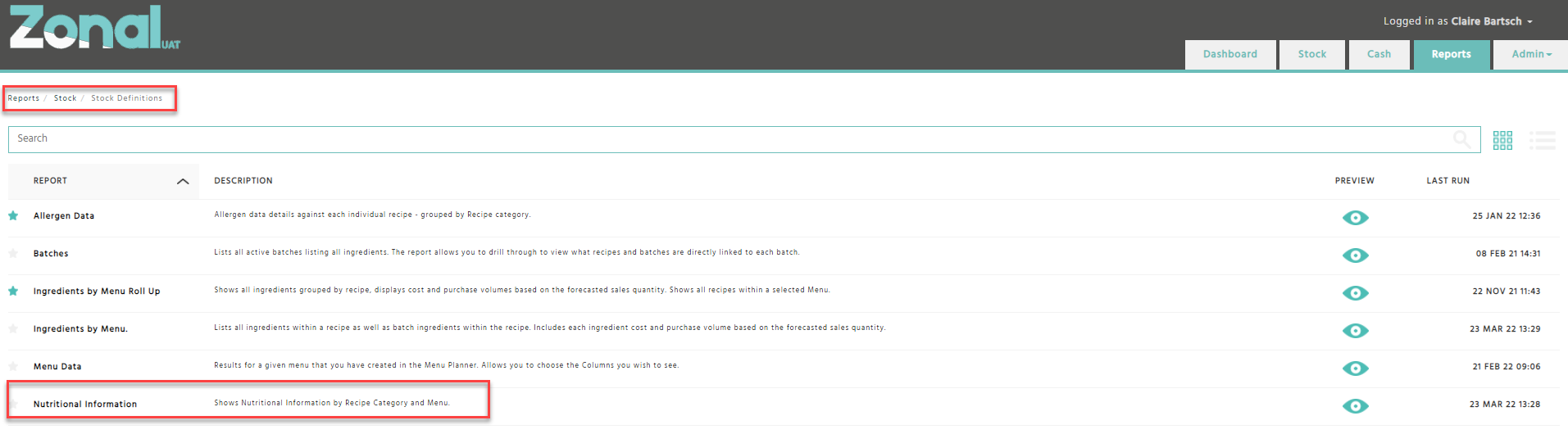 There is a new report called ‘Nutritional information’ that can display the nutritional information of your recipes. The report can be run by recipe category or by menu and it will list all active recipes within the selected parameters.