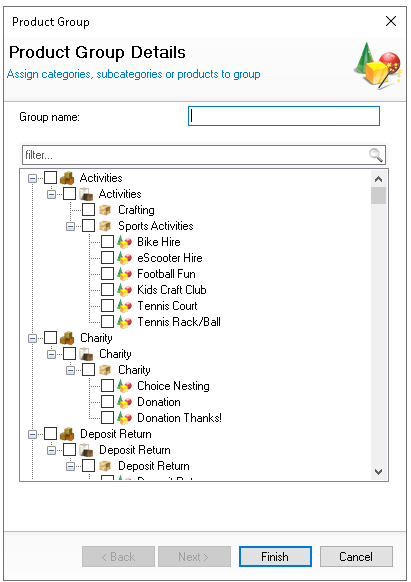 Product groups are used alongside special payment methods in finance to ensure that payments apply only to selected items within a specific group. For example, a £10.00 voucher might be restricted to food items only, excluding any non-food items from the payment. This section allows you to create and manage these product groups.