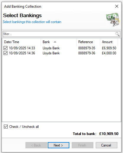 Select the Bankings which are being collected (or taken to the bank) → click Next