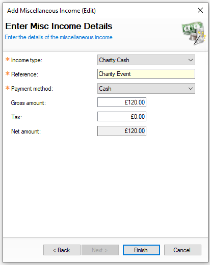 Select the Income Type → enter the Reference → select the Payment Method → enter the Gross Amount → click Finish