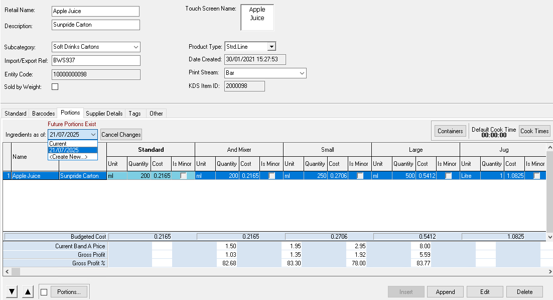 Click Ingredients As Of and choose Create New, click Yes to confirm, select the required Date and click OK