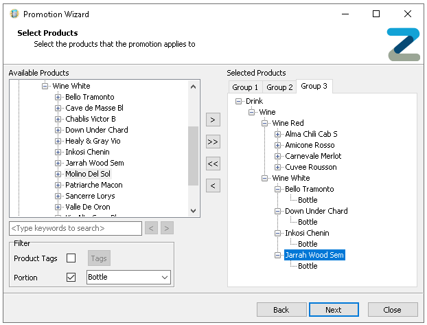 Expand the product hierarchy to make selections and use the arrow buttons to add the selected product levels, individual products and portions, or apply search and tag filters to make finding products easierAt least one product must be added per group before being able to continue -