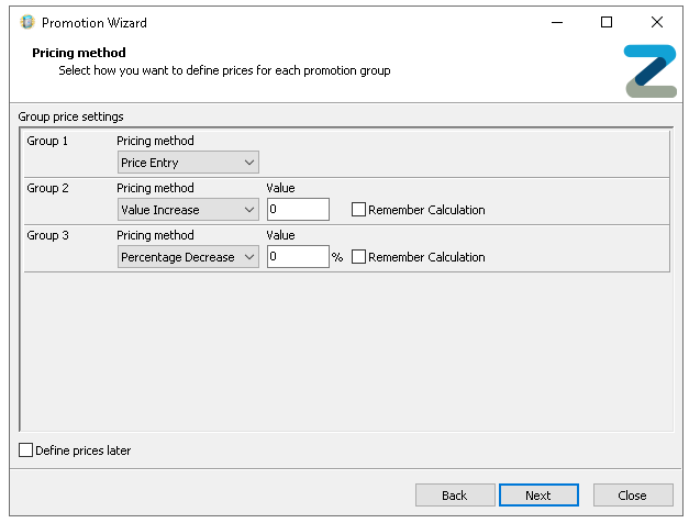If prices are not yet available to be configured selecting 'Define Prices Later' will allow the promotion setup to be completed, the status of the promotion in the promotion list will be shown as Unpriced