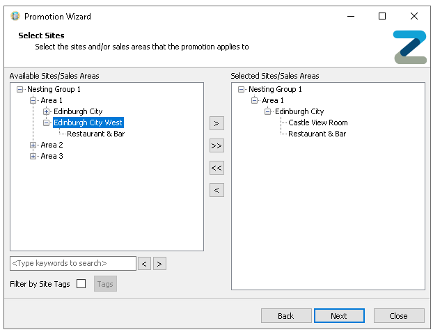 Only those sites and sales areas already added to the promotion will be displayed for selection -