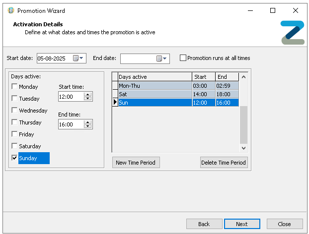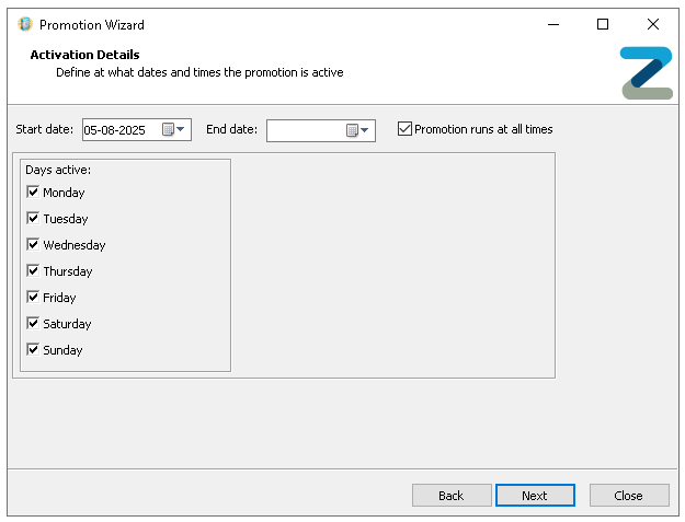 Deselecting the 'Promotion Runs at All Times' setting will enable further customisation for when the promotion will be active