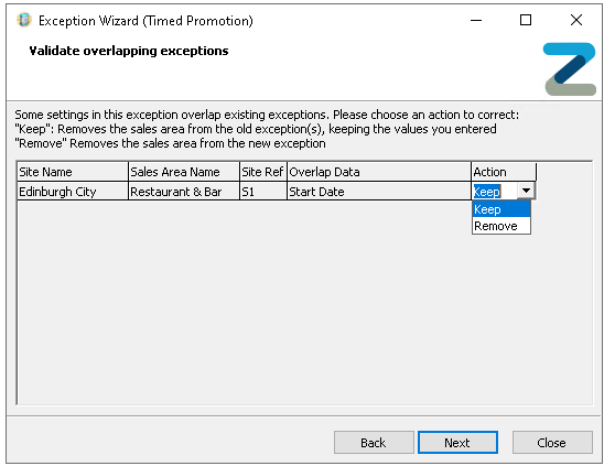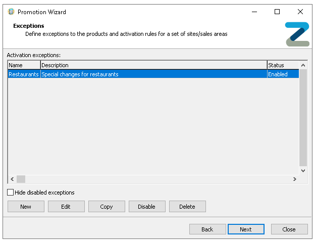 Exceptions allow one or more sites and sales areas to have different activation days and times from the original promotion settings. This enables sites to use the same promotion while running it at times that suit their specific needs-