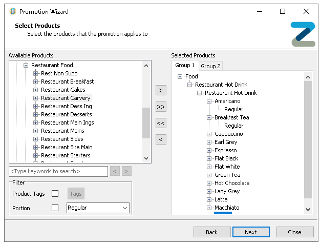 Expand the product hierarchy to make selections and use the arrow buttons to add the selected product levels, individual products and portions, or apply search and tag filters to make finding products easierAt least one product must be added per group before being able to continue -