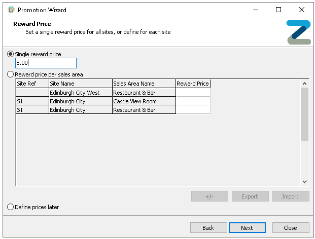 If prices are not yet available to be configured selecting 'Define Prices Later' will allow the promotion setup to be completed, the status of the promotion in the promotion list will be shown as Unpriced -