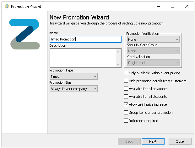 Optionally set Promotion Verification selecting By Card Swipe and choose the required Security Card Group