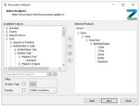 Expand the product hierarchy to make selections and use the arrow buttons to add the selected product levels, individual products and portions, or apply search and tag filters to make finding products easierAs timed promotions are a price change they only have one group, add all required products to Group 1 -