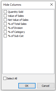 Click the Hide Columns button and adjust columns as required