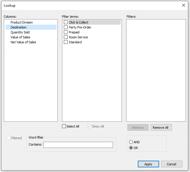 From the Lookup Dialog make the required selection from the Filter Terms which will be added to the Filters list