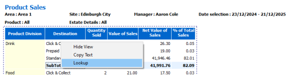 In this example, selecting the product division 'Drink' and 'Drill To Category Mix' applies a filter to only show related structure levels