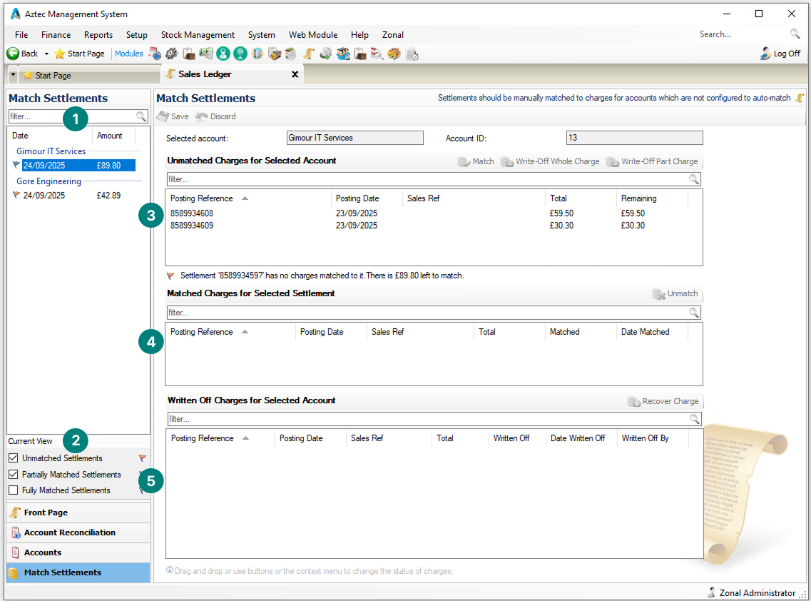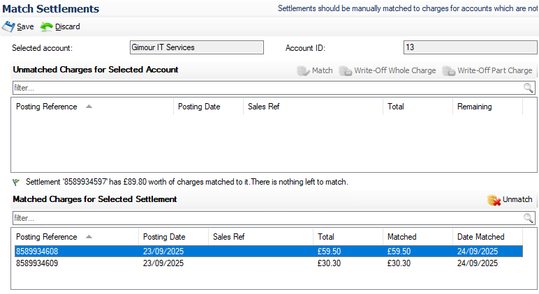 Settlement values might not always match those of the charges for an account, in this case partial matching can occur where a charge is either fully matched leaving an outstanding settlement value or the opposite where the settlement was not enough to cover the full charge amount.