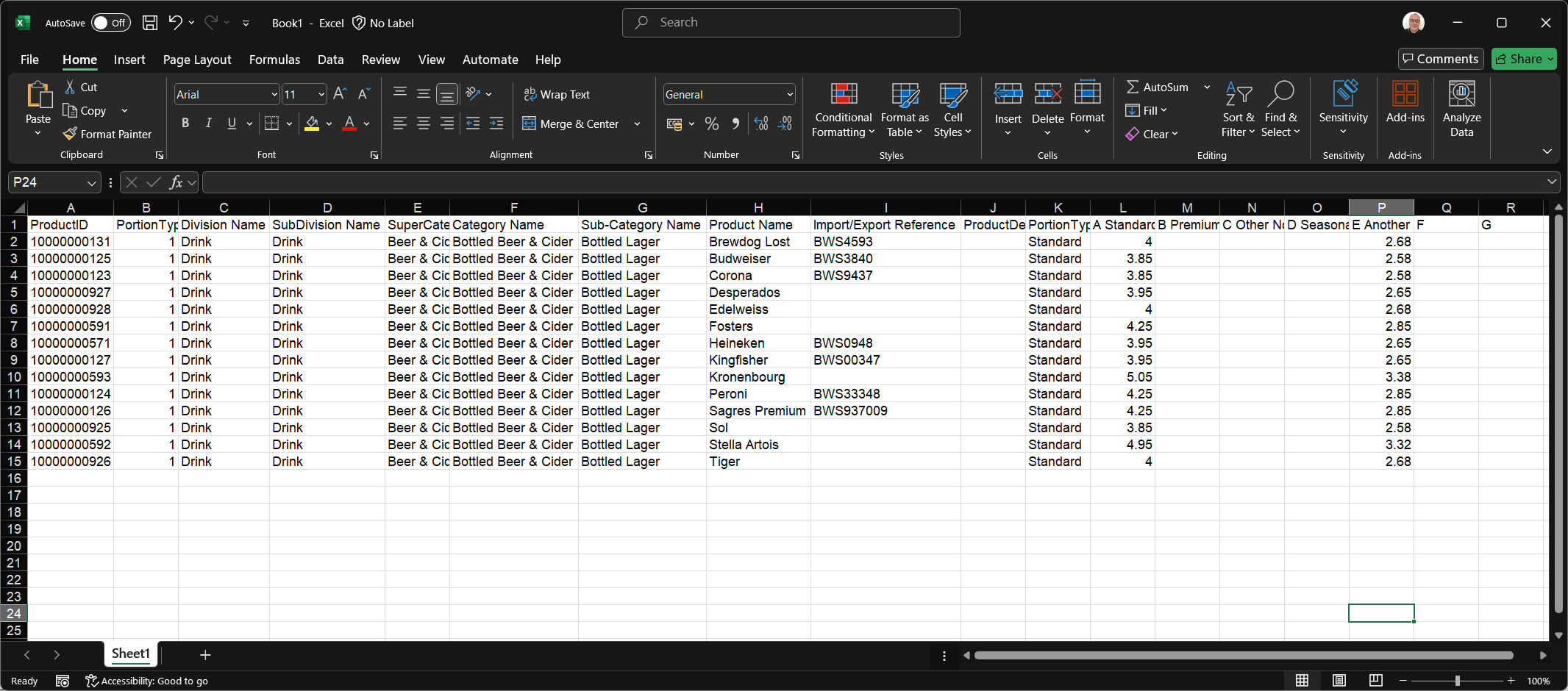 Care should be taken not to change any data in the columns A-K as this information is needed when re-importing back to the price matrix, any changes could cause the import to fail -