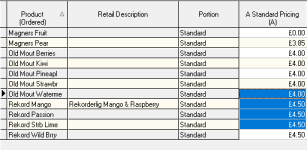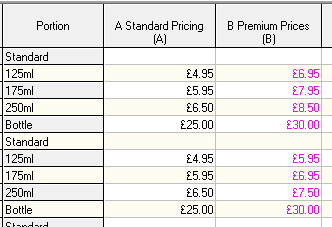 The price matrix is where all selling prices are maintained for both standard line and recipe type products. Each product and portion size is assigned a price within a specific price bands. The matrix consists of 702 price bands, ranging from A to ZZ.