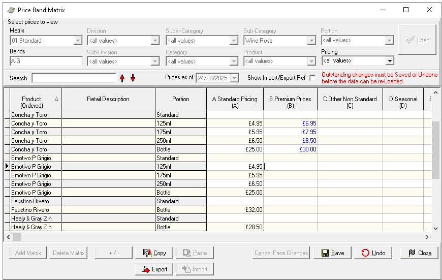 Clicking 'Undo' will revert prices to their original state before the matrix was loaded -