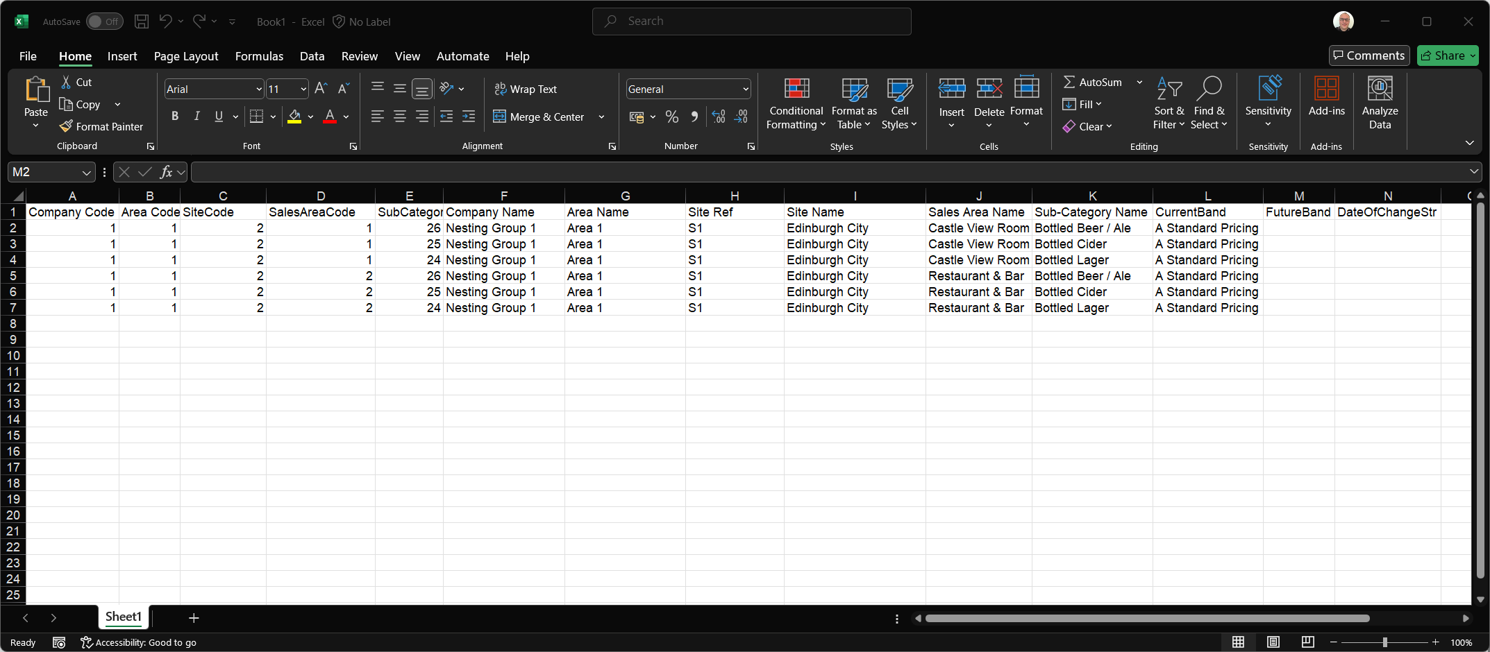 Additional columns will be displayed when pasted into the spread sheet compared to viewing the sales area banding screen -