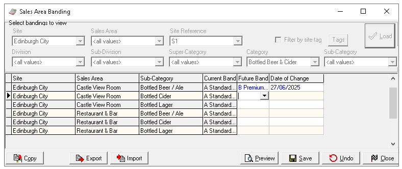 Load the sales area banding with the required sites, sales areas and subcategories that need future changes