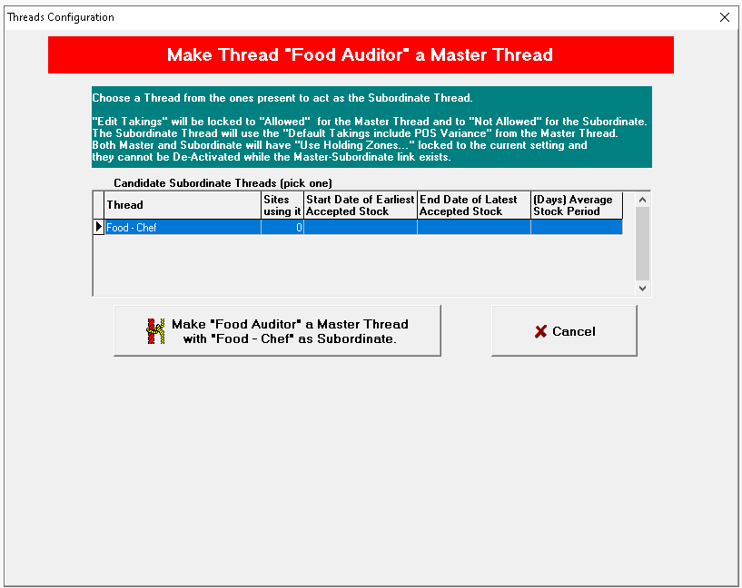 When a created it is classed as a 'normal thread' and has no relation to any other threads of the same product division, if you wish to have a relationship between an auditor and manager thread where the auditor will be classed as the master and auto create stocks the selected thread needs to be converted to a master thread.