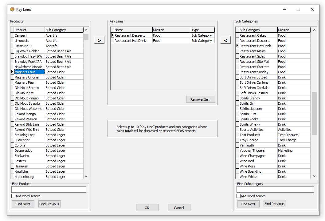 Key lines are specific products or subcategories that can be added to selected reports, allowing team members or managers to monitor their sales during a session. For example, they can be used to track performance in sales competitions, such as who can sell the most desserts or hot drinks. By adding these items as key lines, their sales can be easily tracked and analysed.