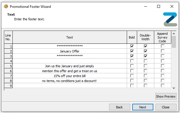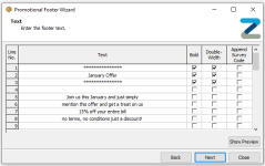 The existing text specified centrally will be displayed, update the Promotional Footer Text against the available 30 lines with the following configurations
