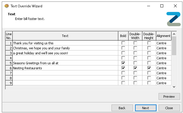 Receipts are configured with footer information text, this information can be overridden in bulk to update for special occasions, holiday messaging and greetings.