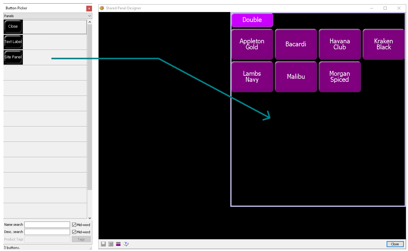 From the Button Picker navigate the required folders and drag the buttons on to the site panel grid (this can also include functional buttons as well as products)