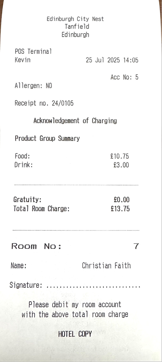 Confirm the charge by tapping Charge Room
